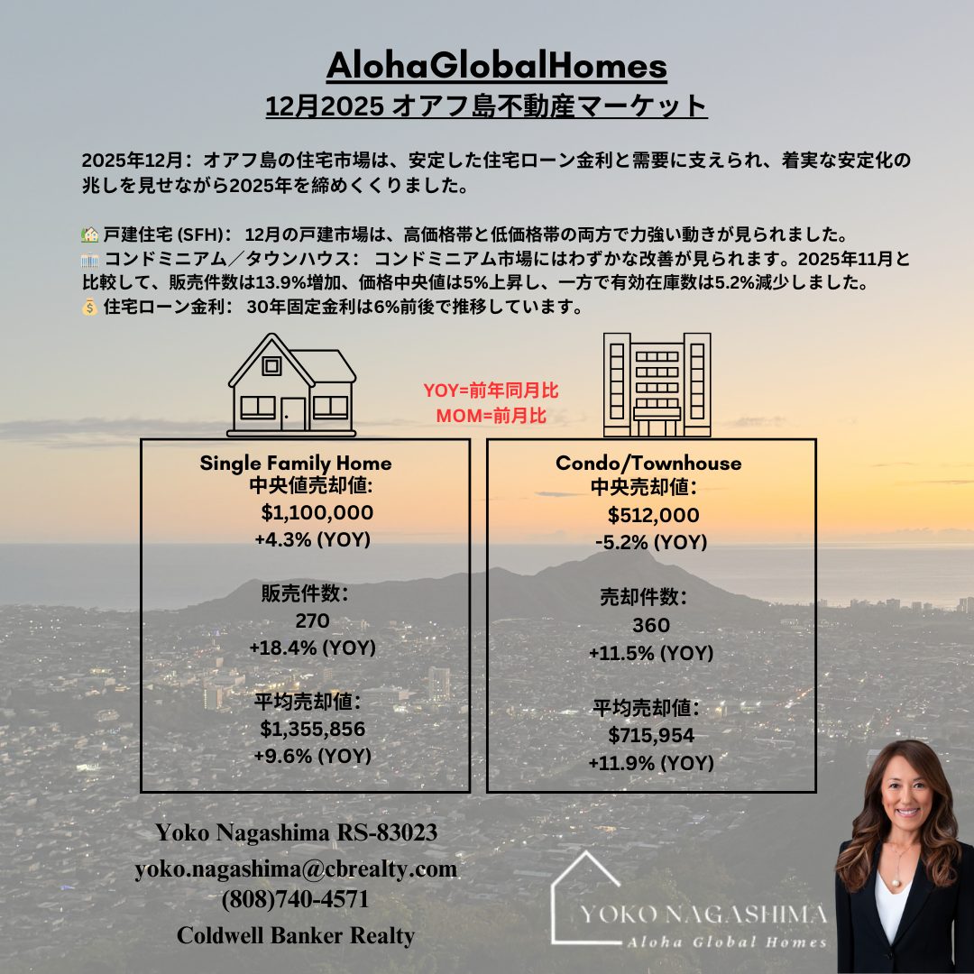 This December 2025 Monthly Stats Report from the Honolulu Board of REALTORS® provides a comprehensive analysis of the O‘ahu housing market for both single-family homes and condominiums. The document outlines a year characterized by market stability, showing that while median sales prices for houses rose to $1,139,000, the condo market experienced a slight pricing softening. Detailed metrics reveal that inventory levels for condos increased significantly, whereas available single-family homes tightened, leading to longer median days on market across both categories. Through extensive statistical tables and historical graphs dating back to 1987, the report tracks essential data like closed sales, pending transactions, and the percentage of original list price received by sellers. Ultimately, the source serves as a vital economic summary of how interest rates and affordability shifts influenced Hawaii’s real estate landscape throughout the year.